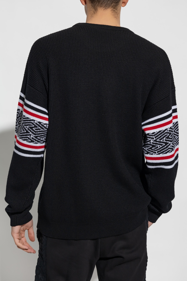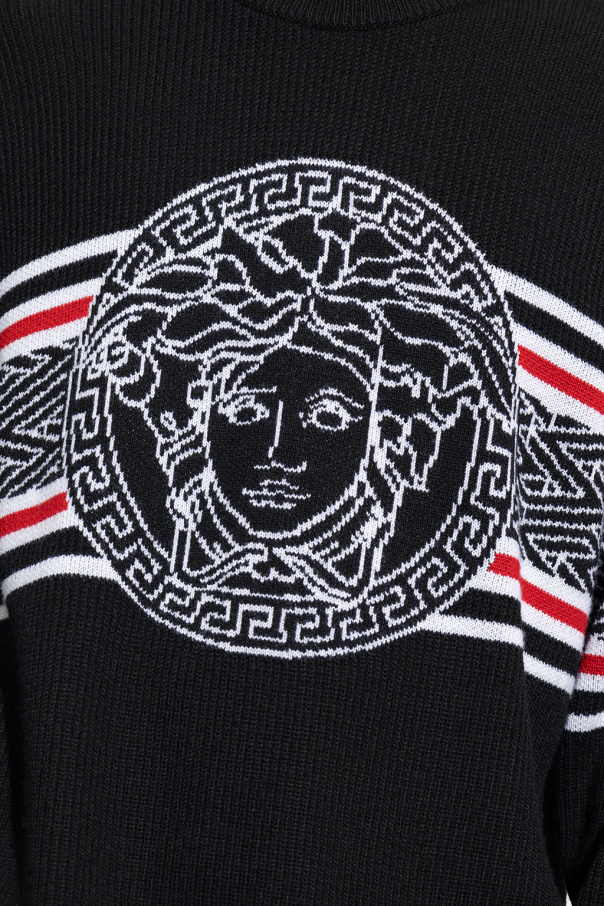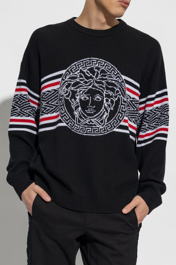 Red, white and red sweater from Versace. Made of virgin wool, this design features a crew neck, long sleeves, ribbed edges and jacquard La Greca Medusa pattern on the sleeves and front.