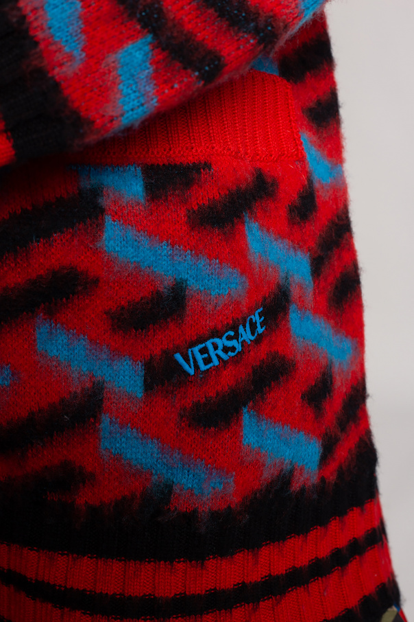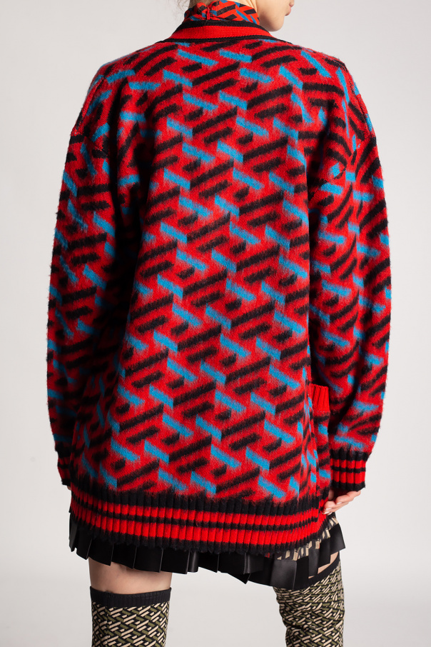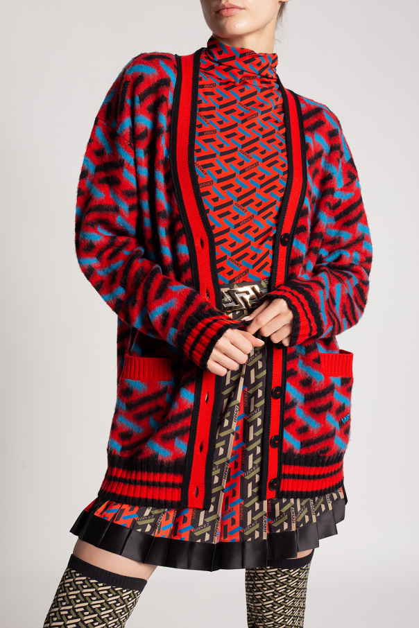 Red, black and blue cardigan from Versace. Made of wool, this V-neck design features button fastenings, long sleeves, the La Greca pattern and two front pockets embroidered with a logo.