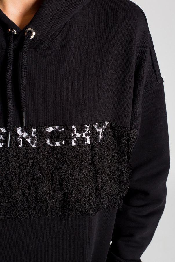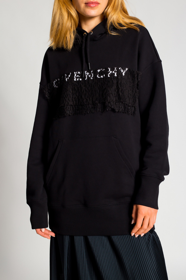 Black hoodie from Givenchy. Made of cotton, this garment features a drawstring hood, white logo print, lace ruffle, two front pockets and ribbed trims.
