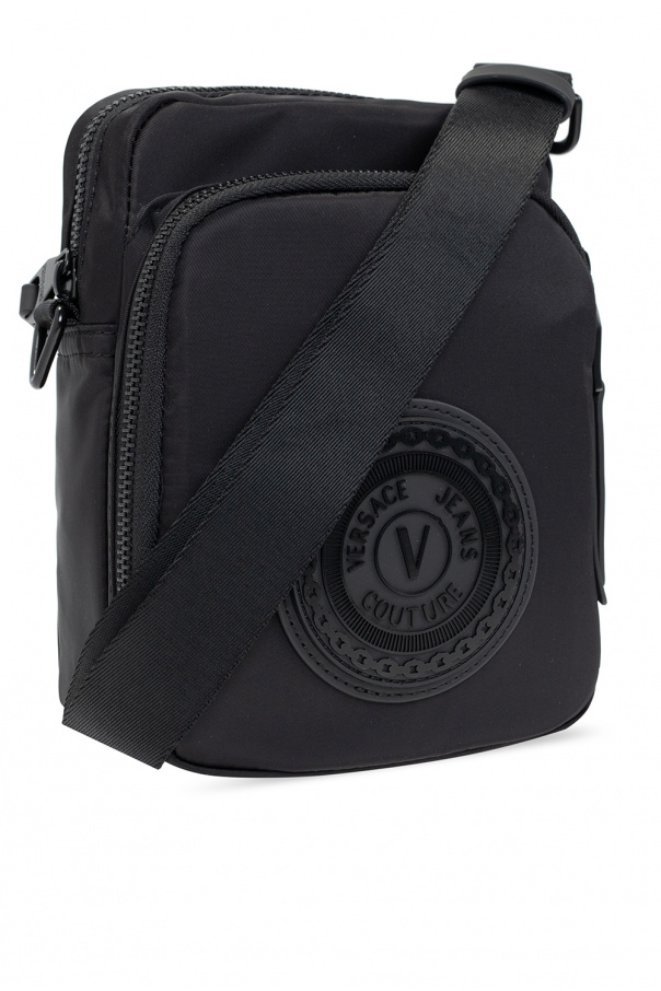 Black shoulder bag from Versace Jeans Couture. This model features two zip pockets, a rubber logo appliqué, detachable and adjustable strap, one internal compartment and black metal hardware.