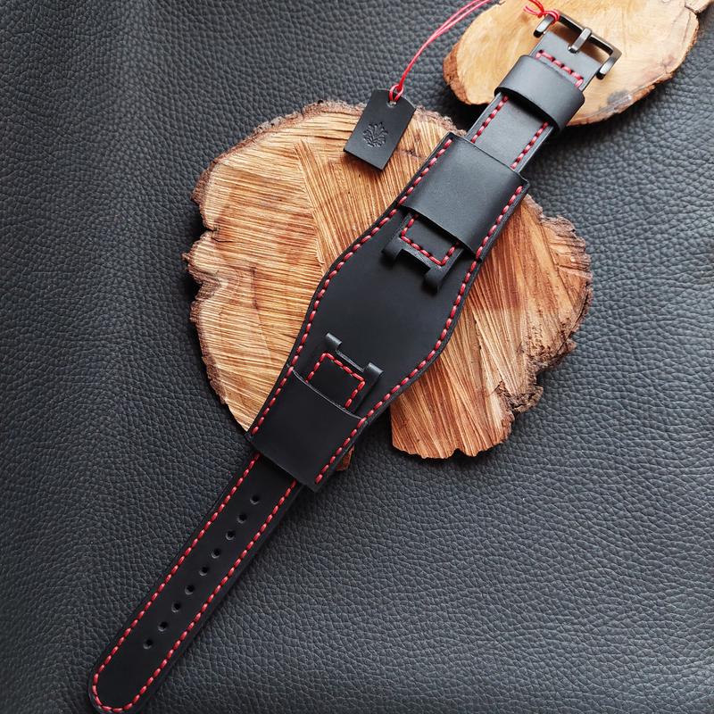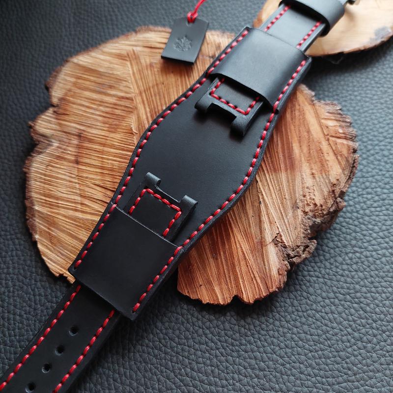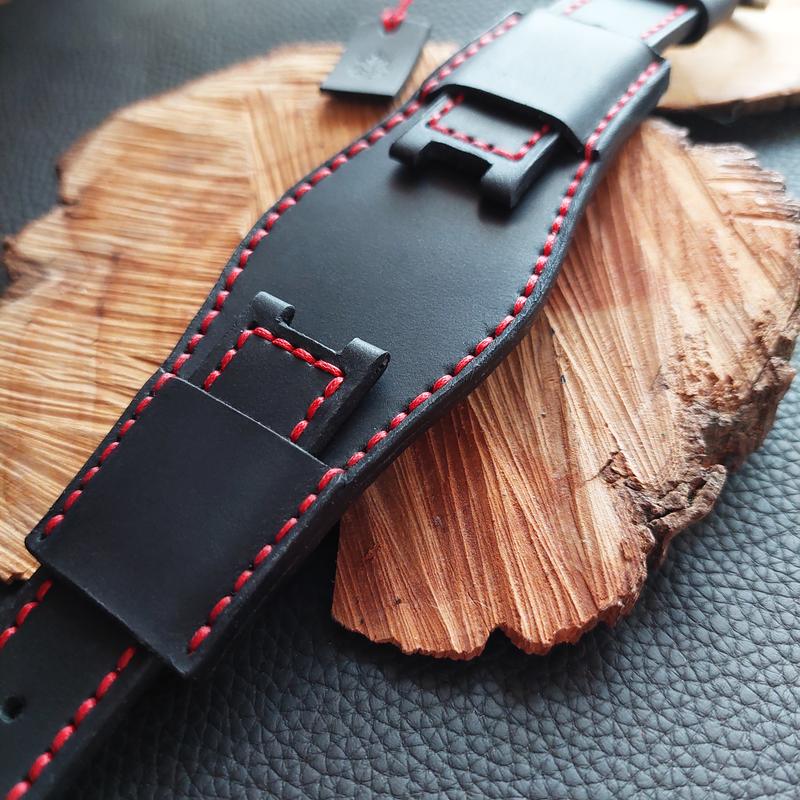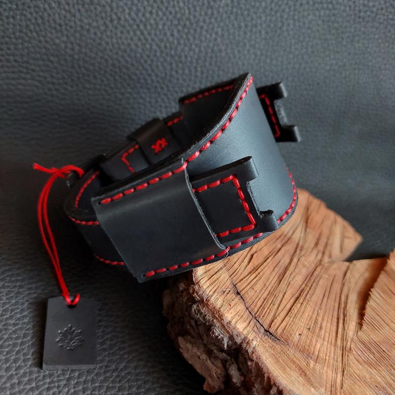 Если Вам надоел металлический ремешок со звеньями который продавался в комплекте с часами? закажите у нас кожаный. Выберите свой цвет кожи и нитку для прошивки. На фото ремешок напульсник черного цвета прошит красной ниткой изготовлен из натуральной кожи Crazy Horse итальянского производства. Это натуральная кожа крупного рогатого скота повышенной плотности, которую получают путем нанесения тугоплавкого воска.