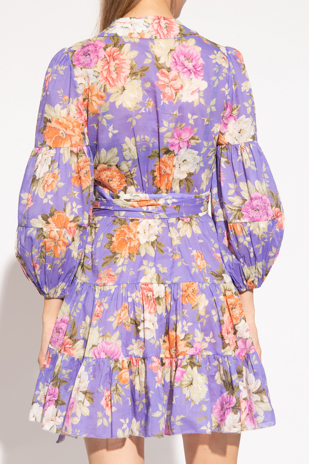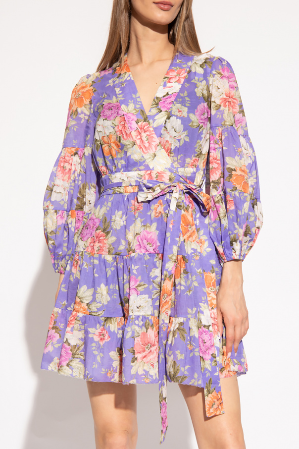 Short, bluish purple wrap-over dress with puff sleeves from Zimmermann. Made of cotton, this V-neck design features a tie waist, multicolored floral motif, puff sleeves with elasticated cuffs and flared skirt with ruffles.