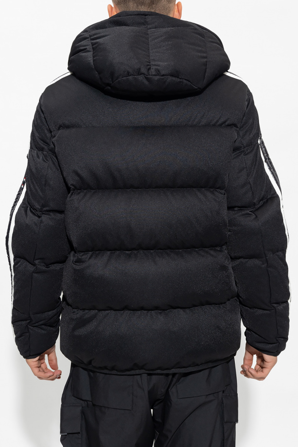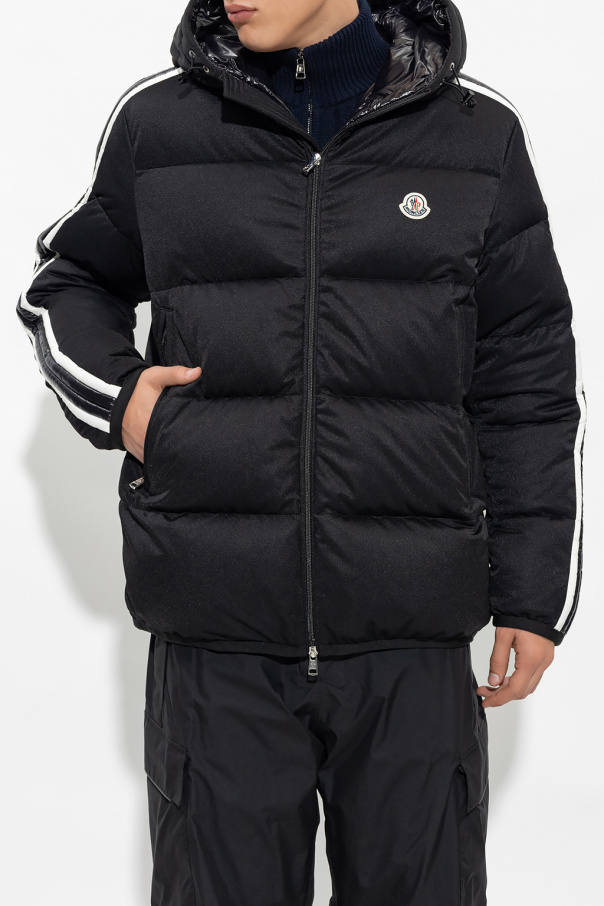 Black ‘Sanbesan’ quilted down jacket with a drawstring hood from Moncler. Emblazoned with a logo patch, this style features a two-way zip fastening, white and black stripes on the sleeves, three zip pockets (two on the front and one on the sleeve), an elasticated bottom hem and cuffs.