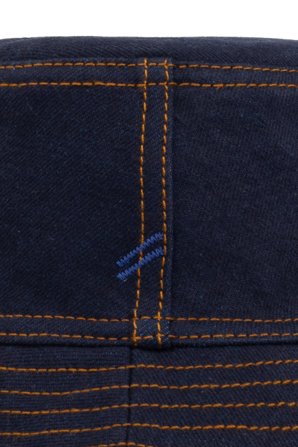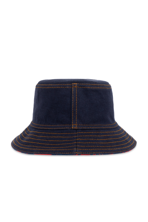 Reversible bucket hat in navy blue denim from Burberry. Made from cotton. The inner layer showcases a red floral pattern.