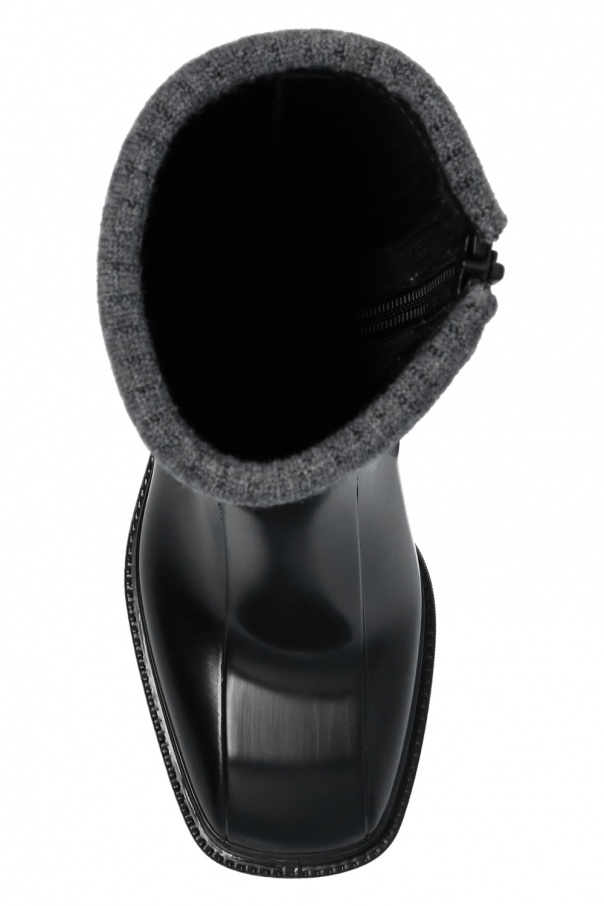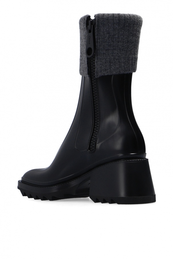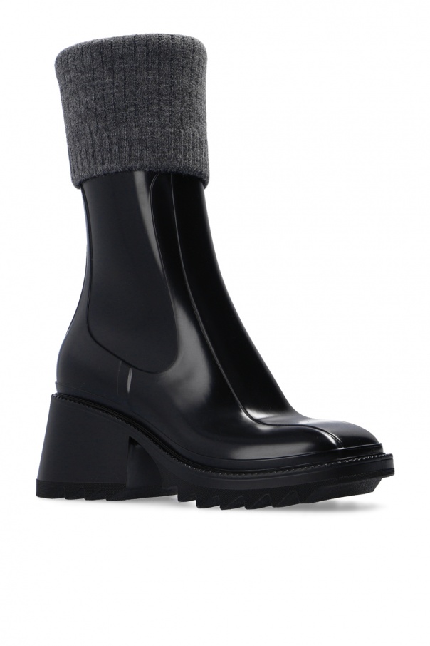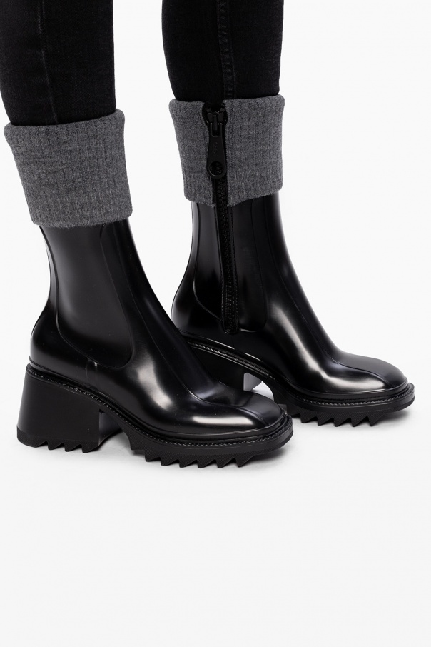 Black ‘Betty’ heeled ankle boots from Chloé. Resting on a black rubber sole, side zip fastening and grey ribbed sock.