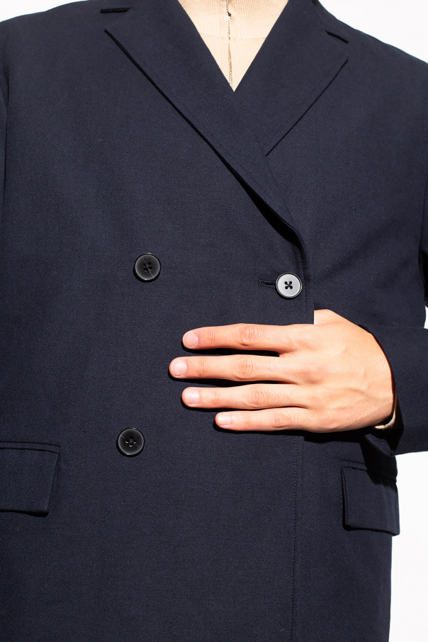 Navy blue blazer from Samsoe Samsoe. Cut with a double-breasted silhouette, this style features button fastenings, notch lapels and two flapped pockets.