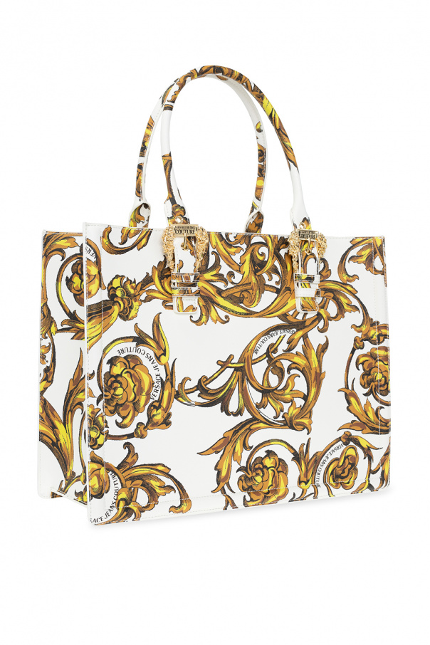 White ‘Couture 01’ shopper bag from Versace Jeans Couture. Embellished with the brand\'s signature ‘Baroque Regalia’ motif in yellow, brown and black, this design features a zip fastening, two half-round handles accentuated with a logo and Barocco buckles, gold-tone metal hardware and one internal compartment with two slip pockets and one zipped pocket.