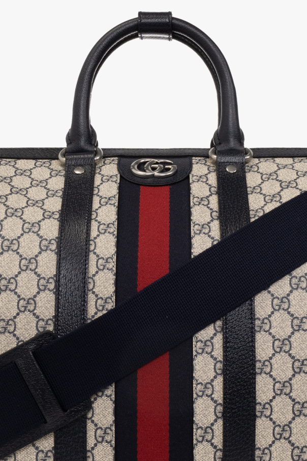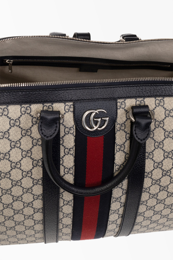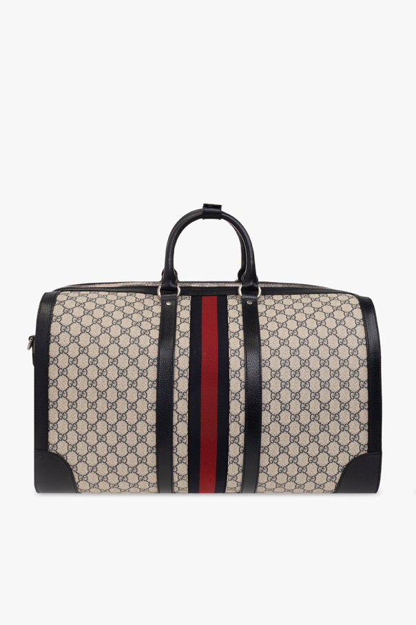 Cream and navy blue ‘Ophidia Large’ duffel bag from Gucci, the ‘Gucci Savoy’ line. Crafted in the brand\'s ‘GG Supreme’ canvas and trimmed with calf leather, this design features a two-way zip fastening, navy blue-red-navy blue ‘Web’ detailing, ‘Double G’ logo hardware, two half-round handles with snap-fastened belt handle shapers, a detachable and adjustable shoulder strap, silver-tone metal elements and one internal compartment with two zip pockets. Comes with a padlock, a detachable identification tag and a key holder.