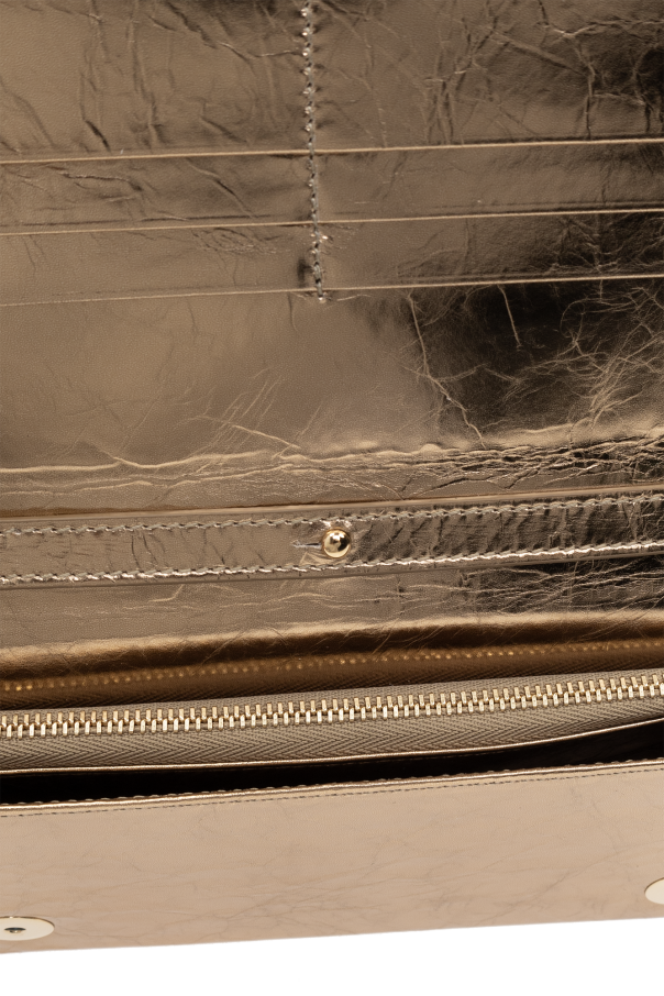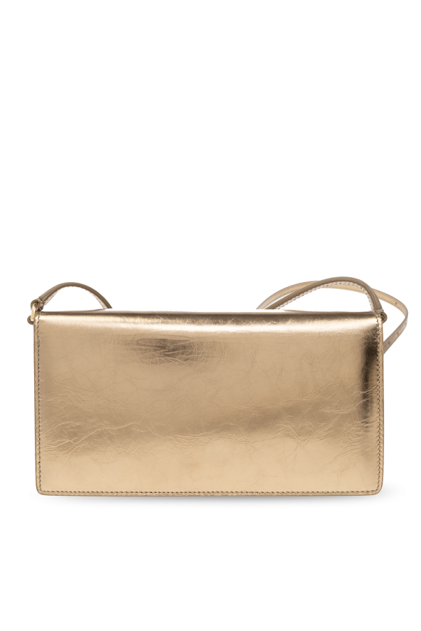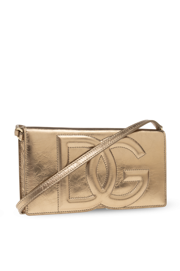 Gold-tone shoulder bag from Dolce & Gabbana. Made of metallic calf leather with distressed details, this design fastens with snaps and features a tactile logo on the front, a detachable and adjustable shoulder strap, gold-tone metal hardware and one internal compartment with one zip pocket and six card slots.