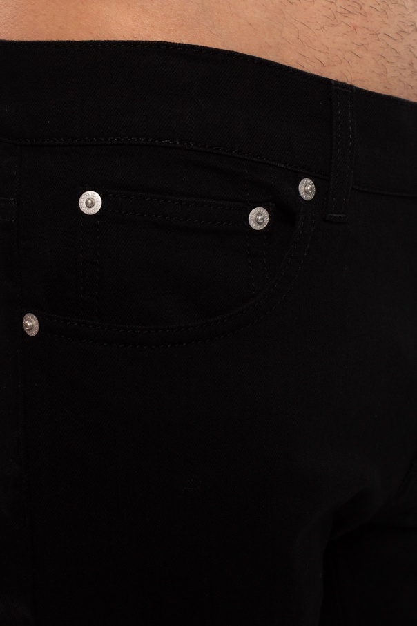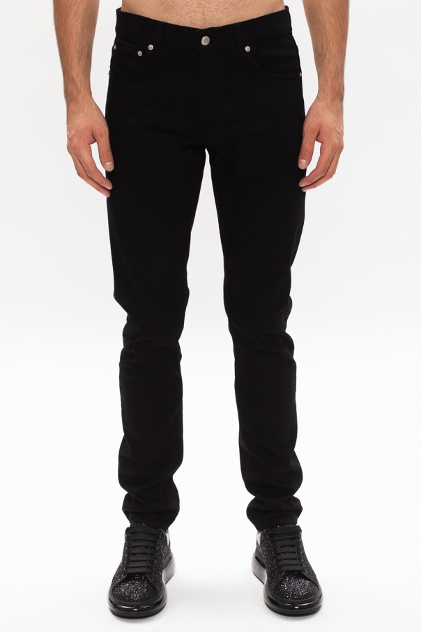 Black jeans from Alexander McQueen. Fastened with a zip and button, this tapered leg design features two front pockets, two back pockets and a patch embroidered with a pattern in white and silver-tone.