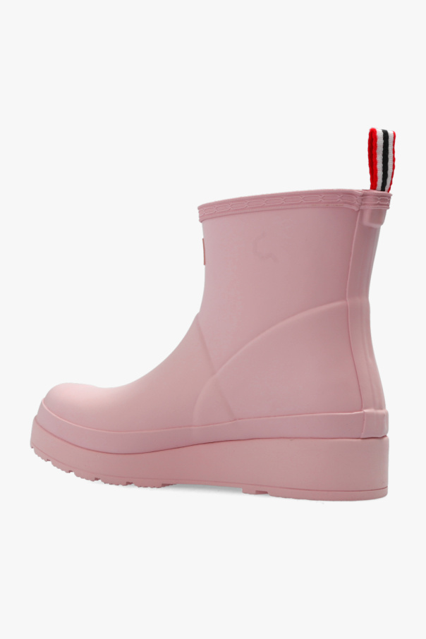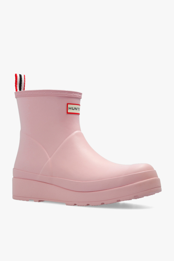 Pink ‘Play Short’ rain boots from Hunter. Handcrafted from vulcanized natural rubber with a matte finish, this pair features a logo detail, white, red and navy pull strap at the back and rubber outsole with the signature Hunter Original tread.