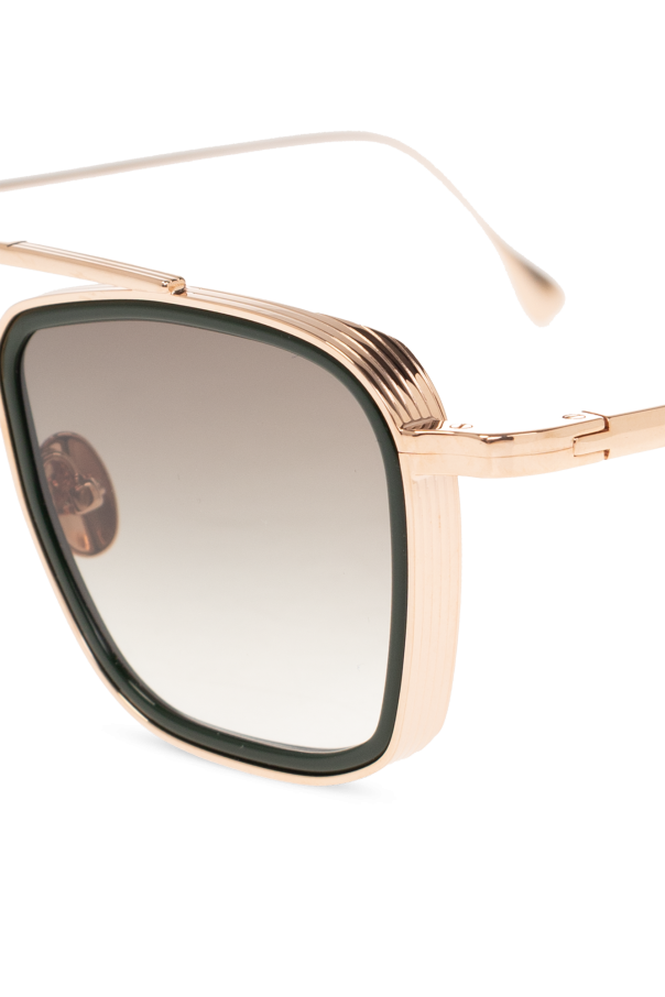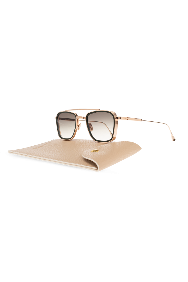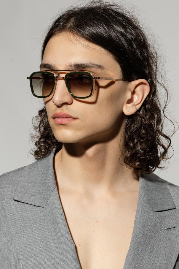 Gold-tone and green ‘Robert’ sunglasses from John Dalia. This pair has a rectangular frame plated with rose gold with rims carved out of a 8mm engraved metal strip. The frame is enlivened by the brand’s signature double bridge, adjustable nose pads, thin temples with branded tips and green anti-reflective CR39 lenses with UV protection. Case included. Handmade in France.