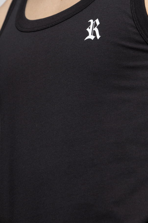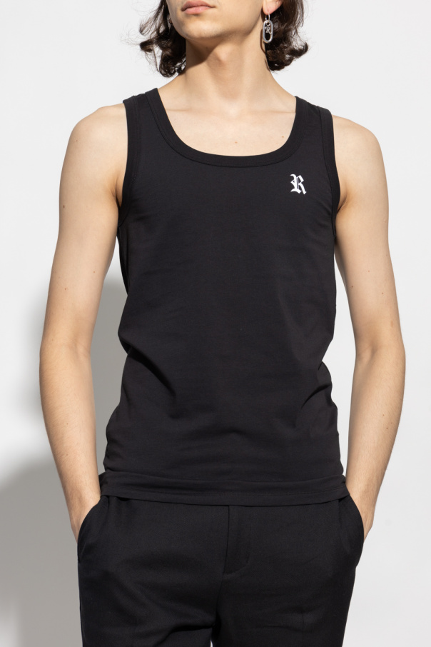 Black sleeveless T-shirt from Raf Simons. Made of cotton, this style features a round neck, a printed white logo on the front and a logo patch at the back.