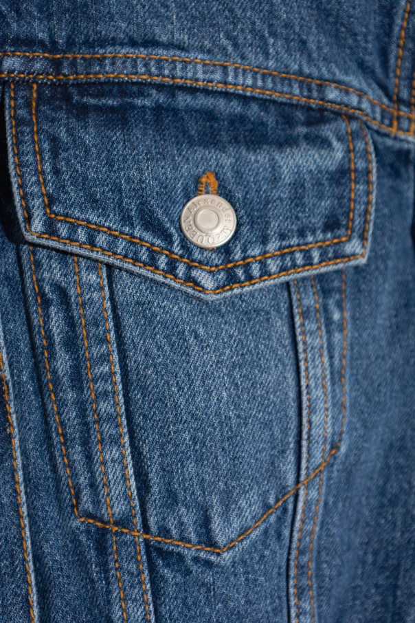 Dark blue cropped denim jacket from Alexander McQueen. Fastened with buttons, this garment features a deconstructed oversize silhouette with long cocoon sleeves, decorative hem and two buttoned flap pockets.