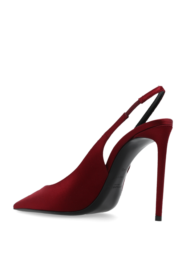 Maroon ‘Zoe’ slingback pumps from Saint Laurent. Made of satin, this pair features a pointed toe and black leather sole.