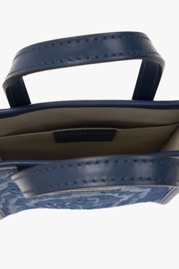 Navy blue and blue jacquard shoulder bag from Etro. Crafted from canvas and trimmed with leather, this design showcases a logo patch and the brand\'s signature paisley pattern. It is complete with a detachable and adjustable shoulder strap, two half-round handles, silver-tone metal hardware and one internal compartment with a slip pocket.