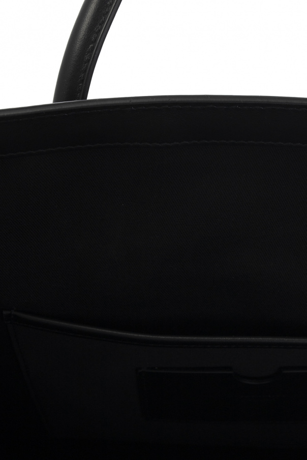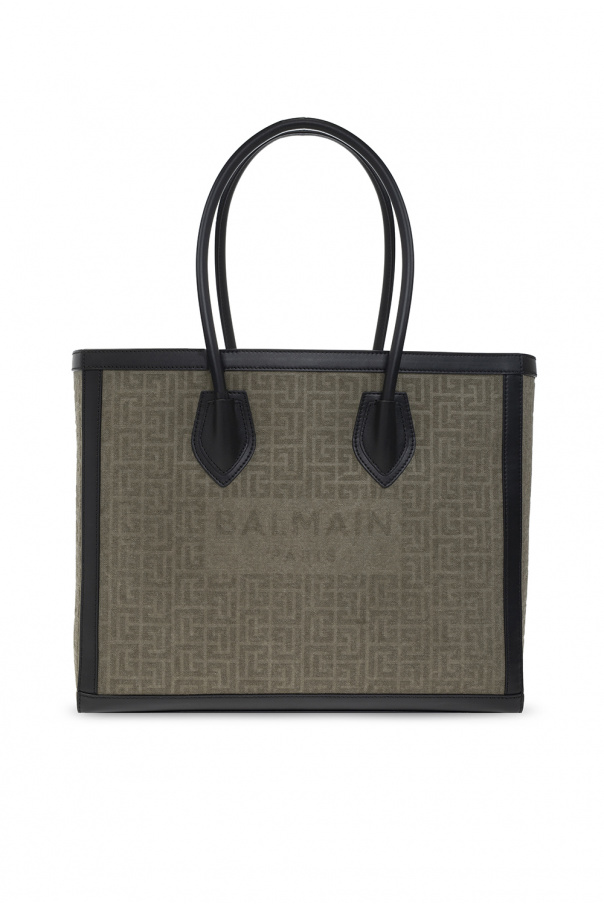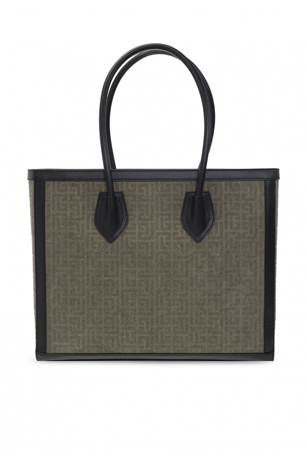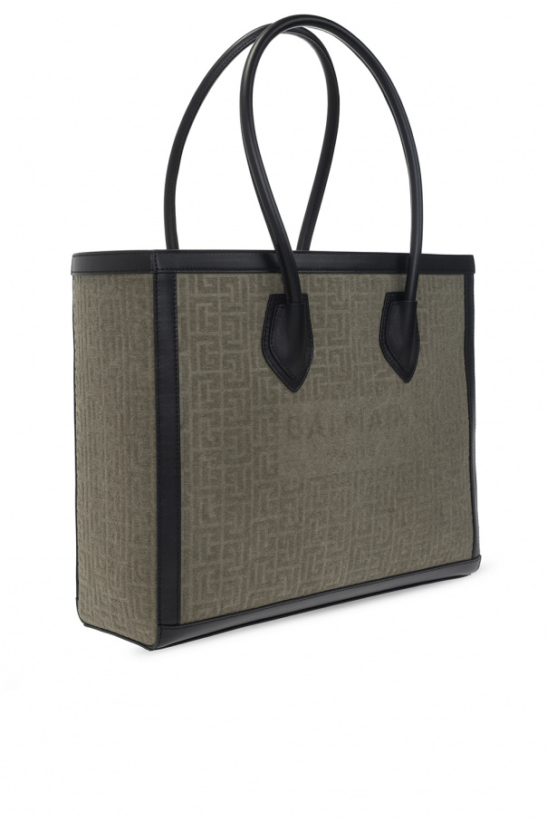 Black and green shopper bag from Balmain. Crafted from cotton and finished with leather, this design showcases a raised logo pattern, two half-round handles and one internal compartment with one slip pocket and one card slot.