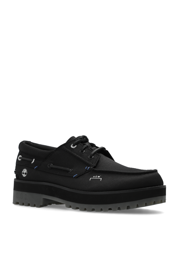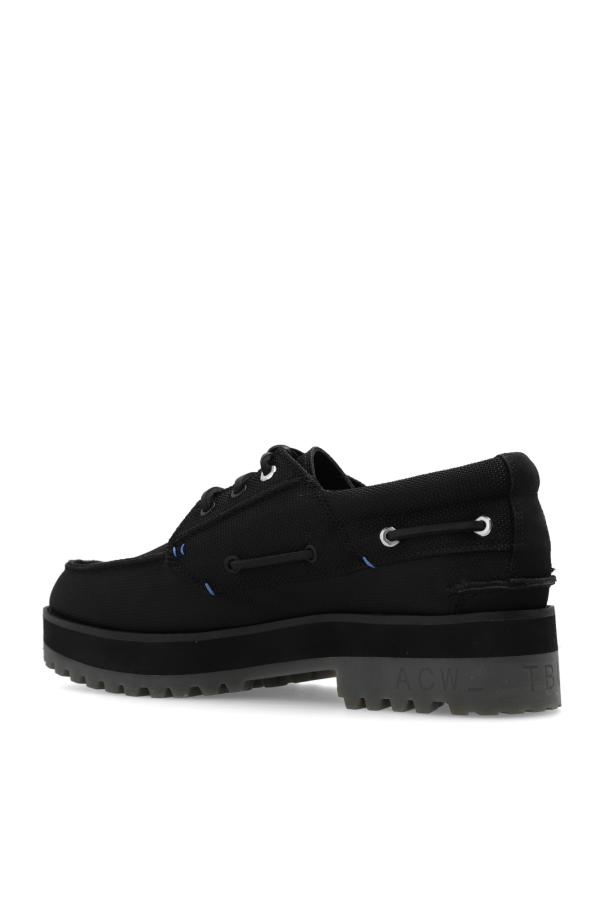 Black ‘3-Eye Boat’ shoes from A-COLD-WALL* x Timberland. Made of fabric with leather trims, this lace-up pair features decorative stitching in blue, white logo print, branded tag and sole constructed from EVA and rubber in black and grey. This product is part of the Future73 initiative, a series of collaborations with world-class designers celebrating Timberland’s 50th anniversary.
