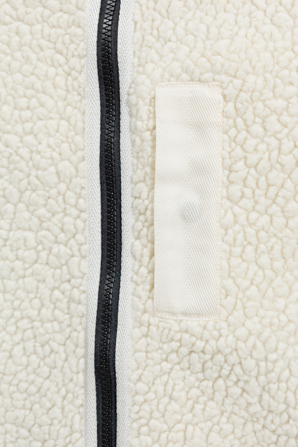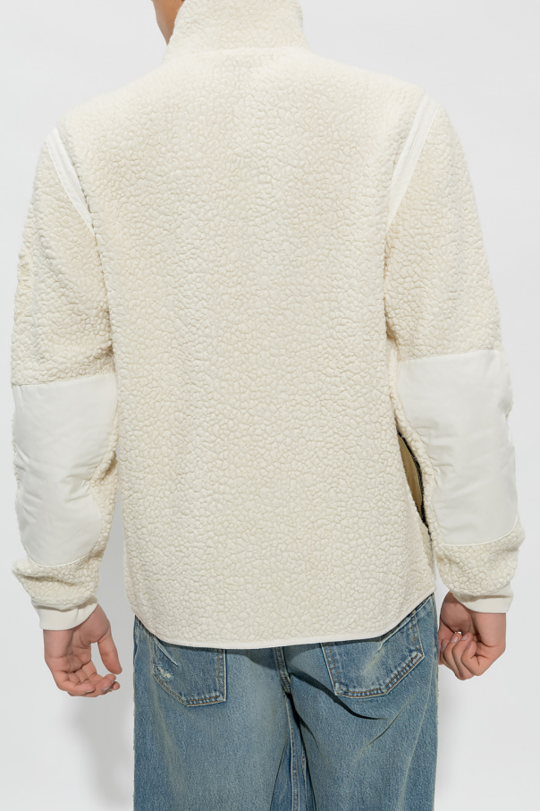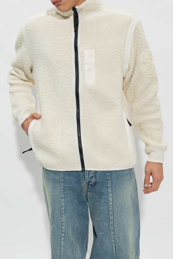 Cream sweatshirt with a stand collar from Stone Island. Made of wool and fabric, this design features a zip fastening, logo embroidery on the sleeve, one snap-fastened pocket, two zip pockets and long sleeves with ribbed cuffs.