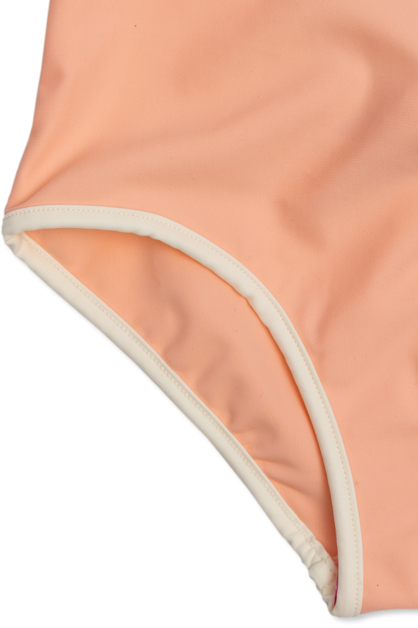 Pink ‘Altamura’ one-piece swimsuit from Bonpoint. Embellished with a pearly logo pendant on the front, this style features an open back with a snap belt and adjustable shoulder straps.