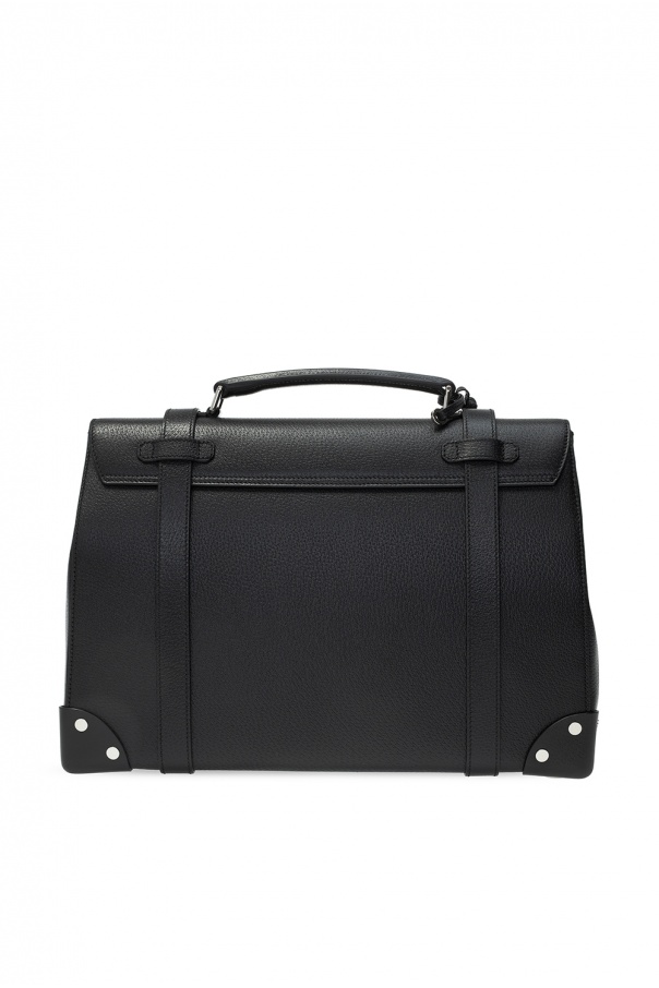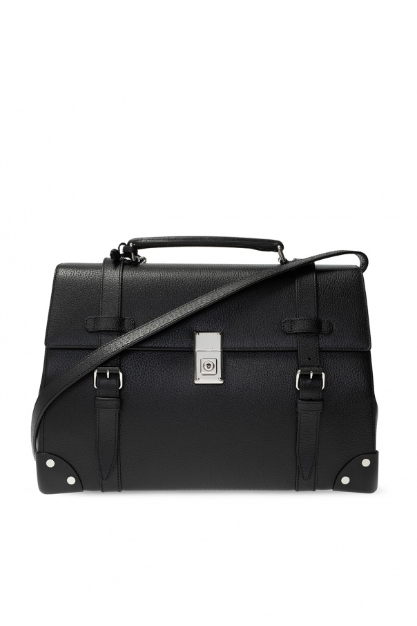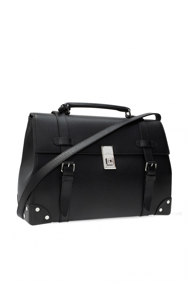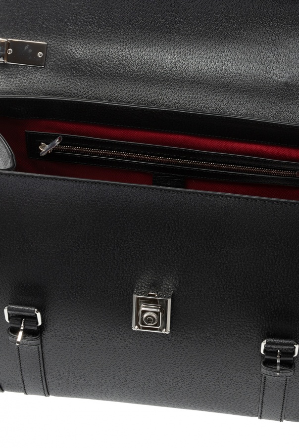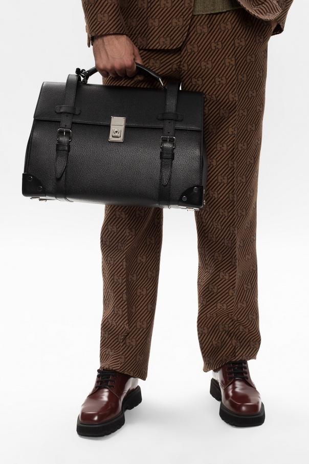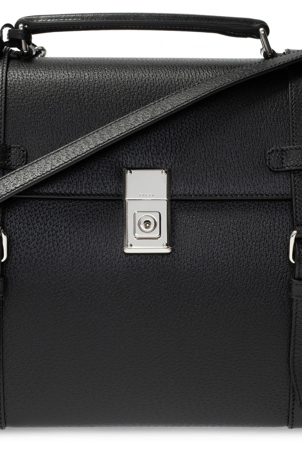Black document case from Gucci. Crafted from textured leather, this design employs distinctive fastener accompanied with buckle straps, a half-round handle, a detachable and adjustable shoulder strap and interior with one compartment, one zip pocket and one slip pocket.