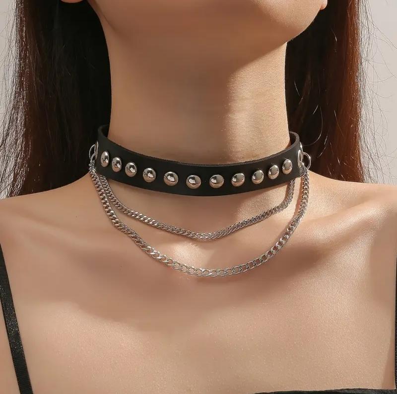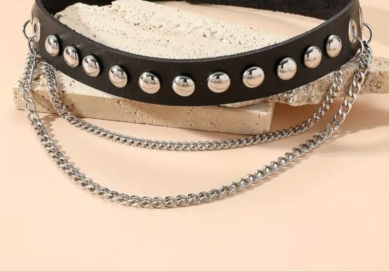 Чокер из натуральной кожи дополнен цепочками и заклепками. Ширина кожаного ремешка составляет 1,5 см, регулируется с помощью пряжки.