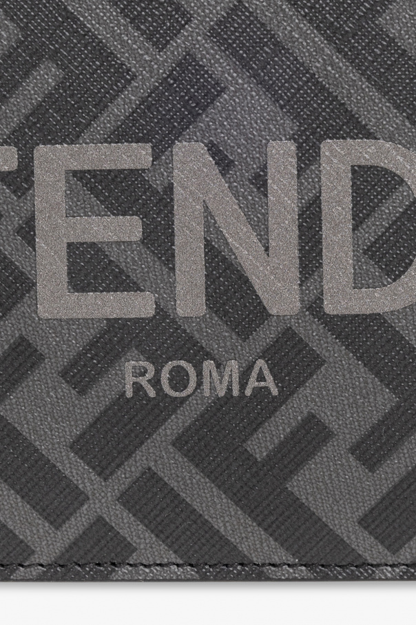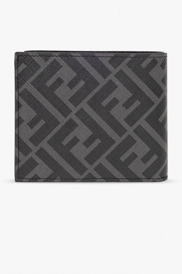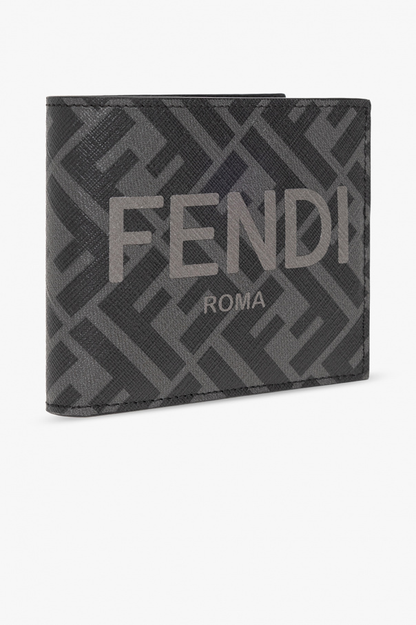 Black and grey bi-fold wallet from Fendi. Crafted from FF jacquard canvas and trimmed with calf leather, this design features a Fendi Roma logo printed on the front and one bill compartment, two slip pockets and eight card slots inside.