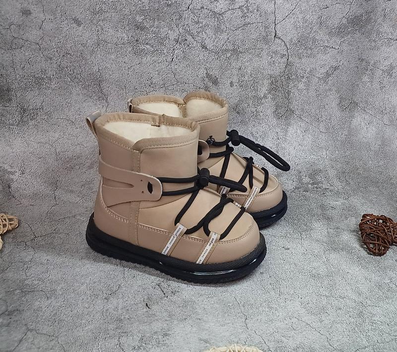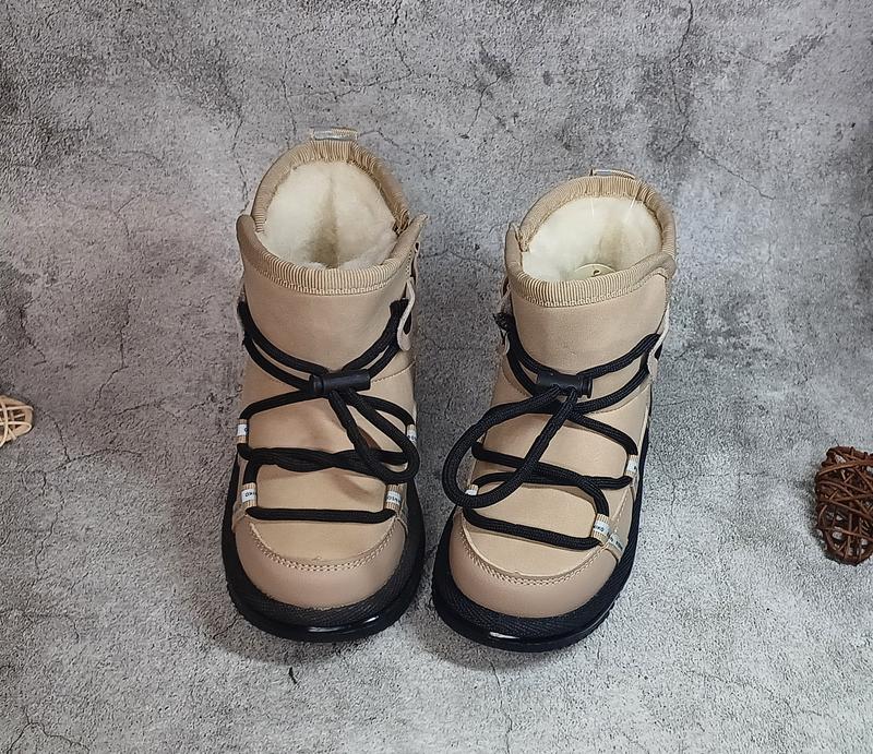 Верх якісна еко-шкіра. Всередині густа овчина 60% натуральна. Фіксація збоку на замочку. Підходять на широку ніжку. Підошва антиковзна. Моделька дуже легка і зручна, не промокають. Температурний режим до - 30°.