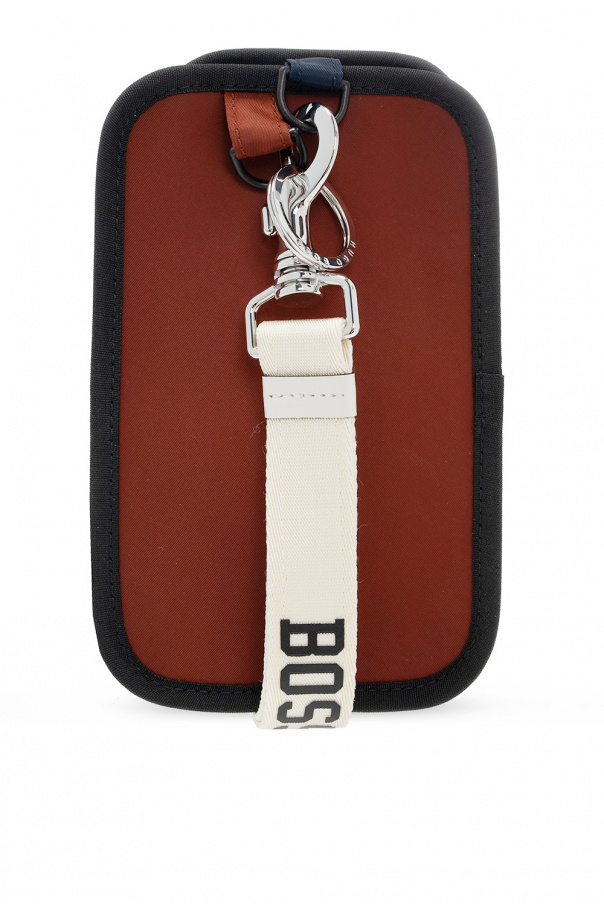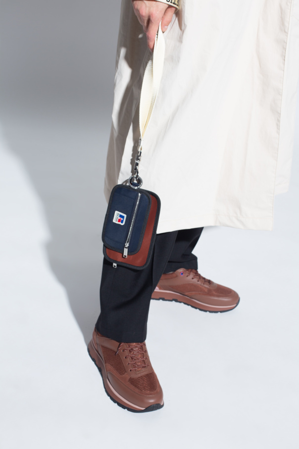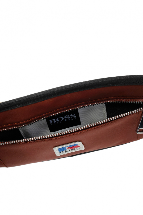 Two pouches in brown and navy from BOSS x Russell Athletic. Fastened with zips, each item features a multicolored logo patch, removable clip and detachable cream strap with a black print. The collaboration presents bold, off-court classics that combine relaxed fits, sporty details, and a retro-inspired colour palette.