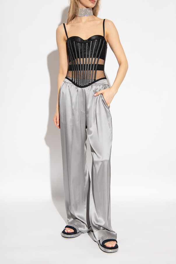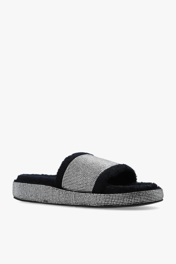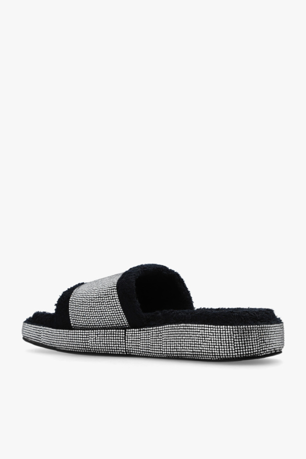 Black slides from Dolce & Gabbana. Made of terry fabric, this pair features silver-tone crystals and black leather sole.