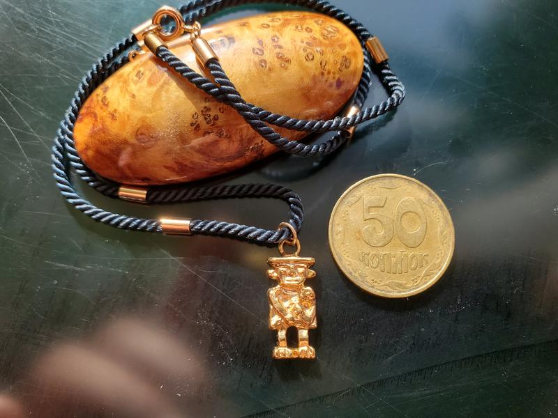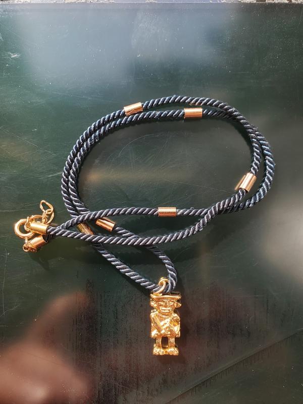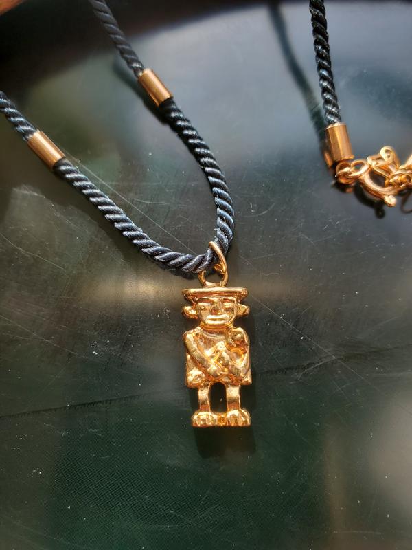 Винтажное колье из Америки с подвесом в стиле мезоамерики ацтеки\\майя подвесом, бронза с вероятно позолотой 24К, размер подвеса 20х 19мм, веревок темно синего цвета из золотистого тона фурнитурой длина 44см с удлинителем, необычное и стильное колье из Америки в традициях коренных жителей Америки, в коллекцию или на подарок.