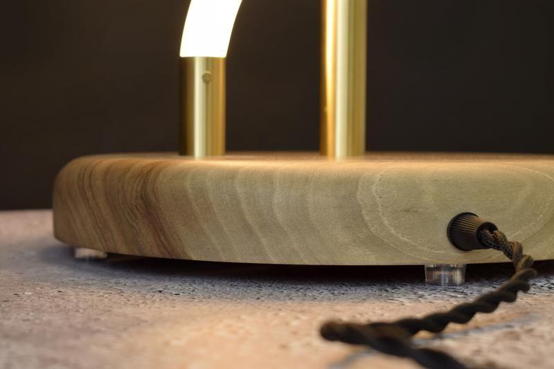 Современный напольный торшер, сочетающий в себе изысканный минимализм и элегантность. Он полностью выполнен из массива натурального ореха и латунной трубки.
