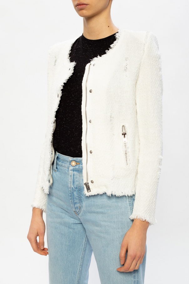 White jacket from Iro. Constructed from textured cotton boasting raw-cut, frayed edges, this style fastens via a zip and snap-buttons and employs a round neckline and two zipped front pockets.