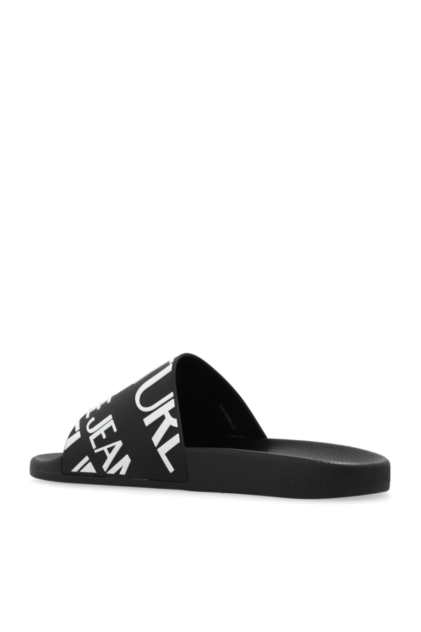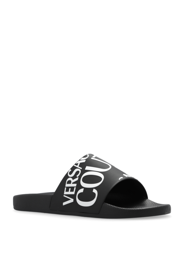 Black slides from Versace Jeans Couture. Made of rubber, this model showcases a tactile logo pattern in white.