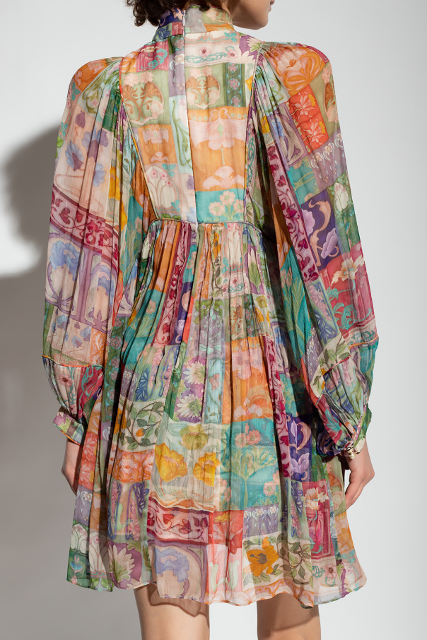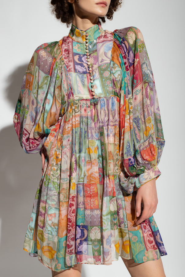 Multicoloured mini dress from Zimmermann. Crafted from semi-sheer material with a relaxed silhouette, this style showcases a floral tiles print. It is complete with a standing collar, crystal-bejewelled buttons on the front, a hidden back zipper, puff long sleeves with button cuffs and a flared hem. It comes with a matching camisole.