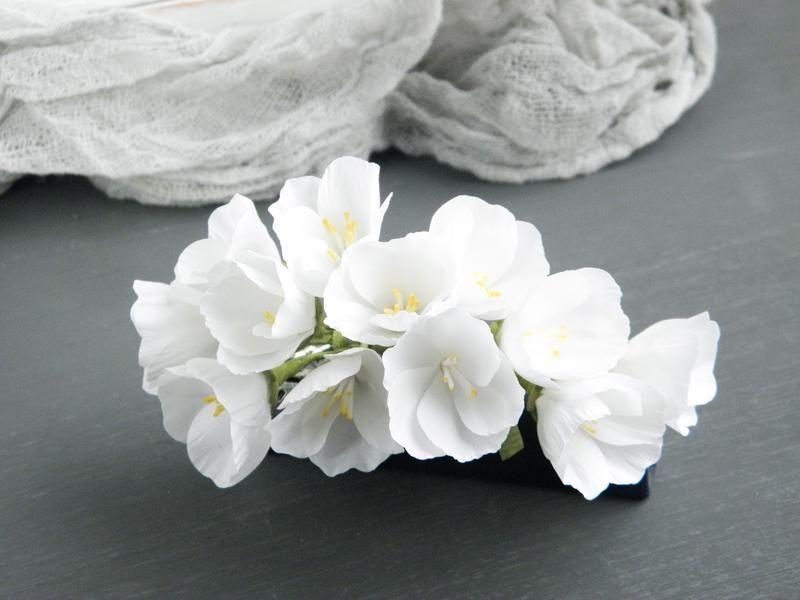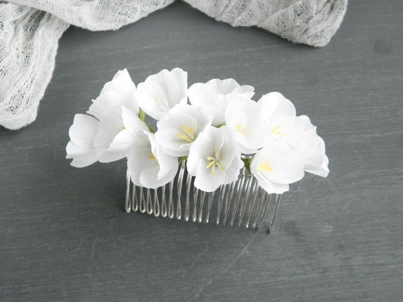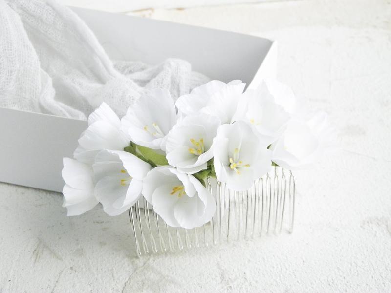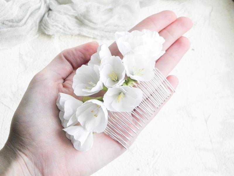 Нежный гребень с белыми цветами яблони украсят вашу прическу как в будни дни, так и в праздник. Стильный оригинальный и в то же время нежный аксессуар. С таким украшением вы не останетесь без внимания!