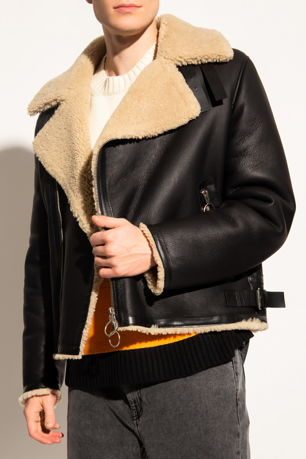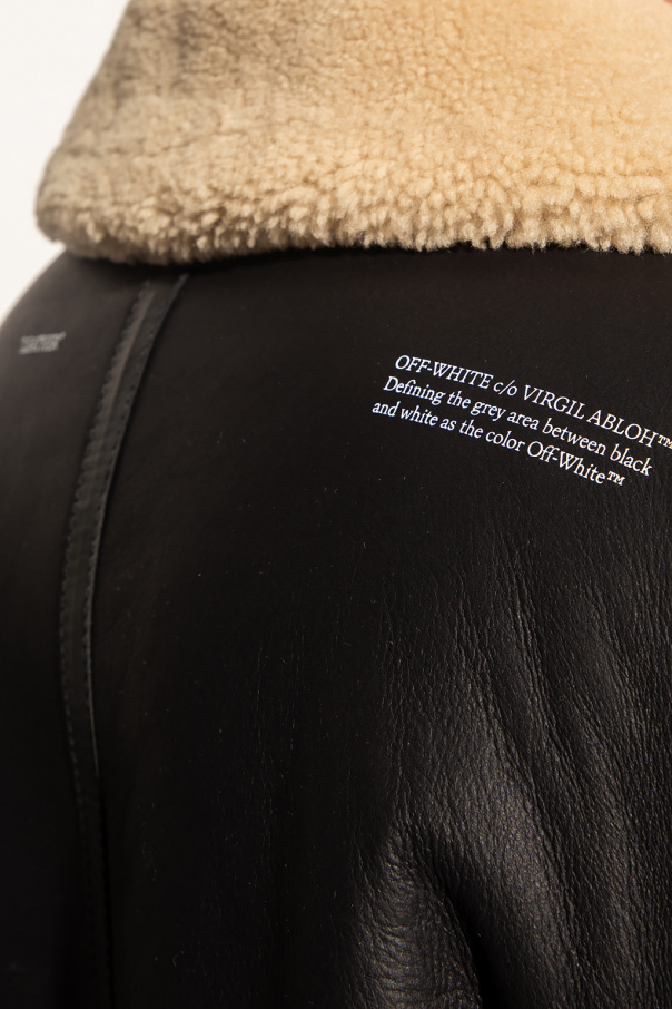 Black shearling coat from Off-White. Crafted from sheep leather, this style fastens via a two-way zipper and features buckle tab adjusters at the collar, two zipped pockets on the front, a light beige sheep fur lining and a white graphic print with the brand\'s logo on the back.