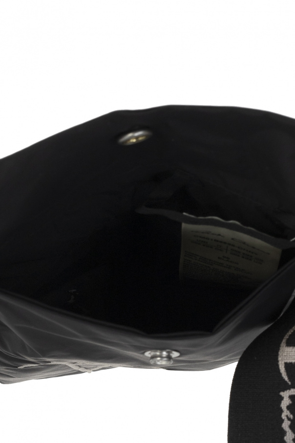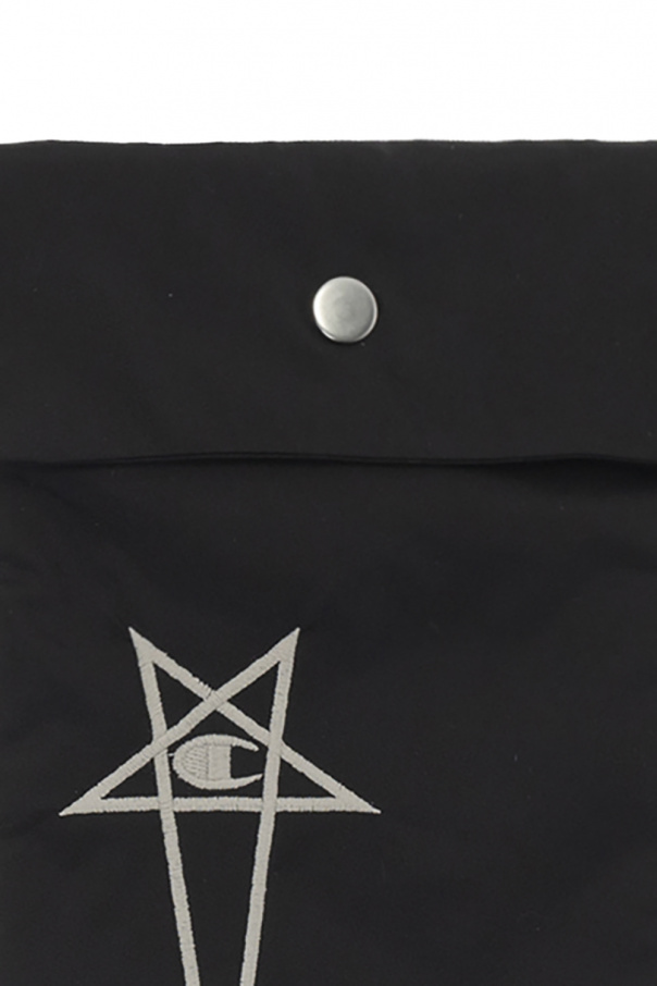 Black pouch from Rick Owens x Champion. Embroidered with the brand\'s logo, this design features a snap fastening, an elastic strap with a pattern in beige, silver-tone metal hardware and one internal compartment.