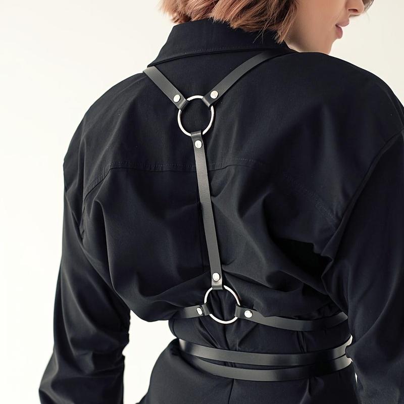Портупея на грудь подчеркивает соблазнительные формы и привлекает внимание к фигуре. Черные ремешки разной ширины образуют на женском теле красивые рисунки. Смотрятся портупеи очень соблазнительно.