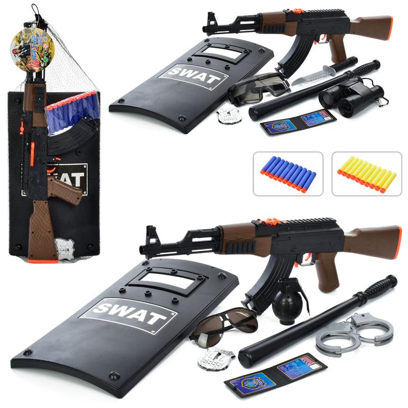 Позвольте малышу почувствовать себя настоящим героем, который защитит мир от преступности вместе с таким набором полицейского, он обязательно понравится Вашему малышу, комплектация набора соответствует фото, автомат длиной 56,5 см, мягкие пули, всего 8 предметов, 2 вида, размер в упаковке 57-22-9 см.