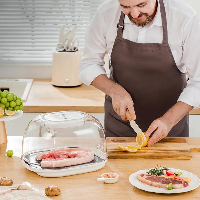 использует температуру воздуха на вашей кухне, чтобы разморозить нарезки мяса,