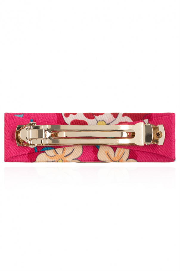 Pink hair clip from Salvatore Ferragamo. Made of silk, this design features a multicolored floral print and brass elements in gold-tone embossed with a logo.