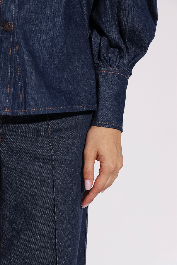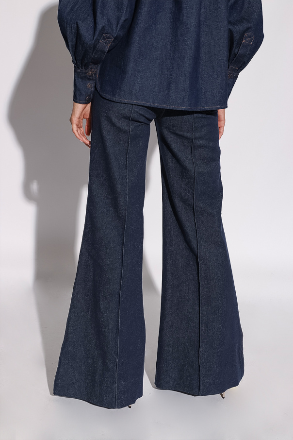 Navy high-waisted jeans from Zimmermann. Fastened with a zip and button, this pair features a metal logo-engraved appliqué in gold-tone, logo patch, two front pockets, two back pockets with stitching at the back and wide legs with distinct seams down the middle.