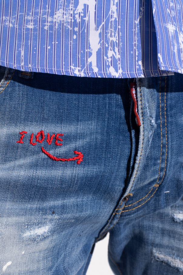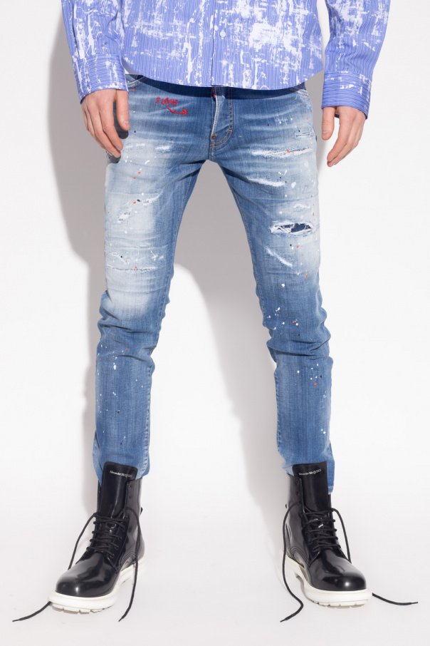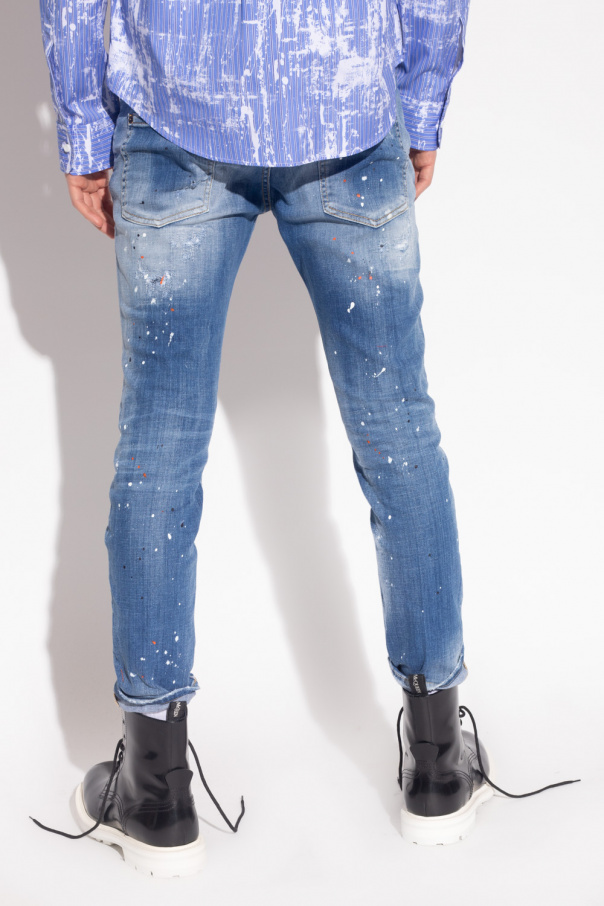 Blue ‘Skater’ jeans from Dsquared2. Falling with tapered legs, this pair features a hidden button placket with a red and white logo tag, distressed detailing, classic five pockets, a logo-embossed back patch and white, black and orange paint splatters.