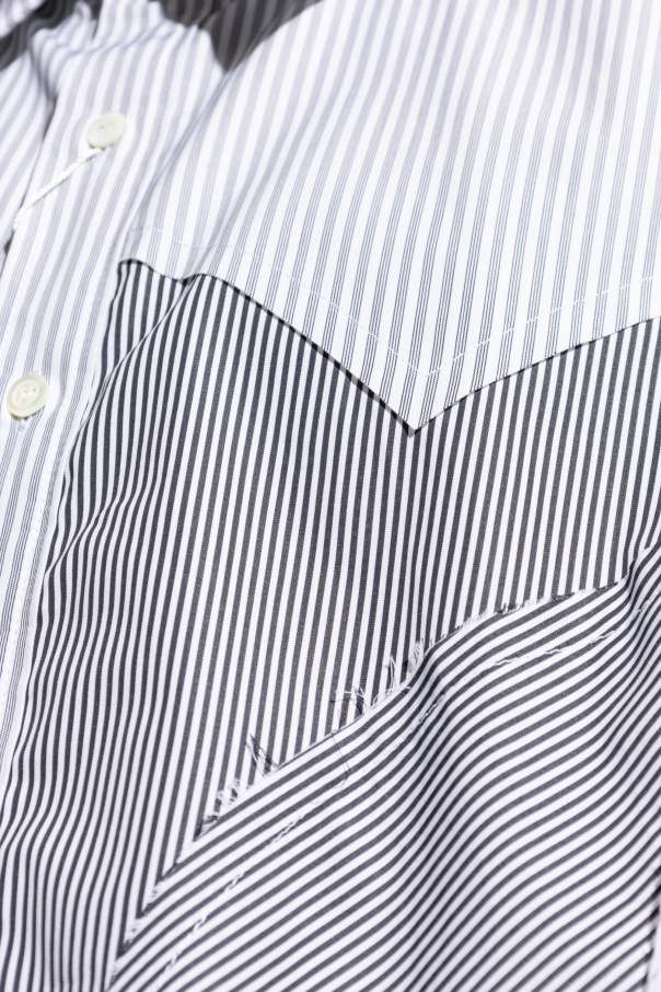 Introducing the Striped Pattern Shirt from the exclusive collection by Maison Margiela, a paragon of sartorial excellence and avant-garde design. Meticulously crafted from 100% cotton, this shirt boasts a classic, straight cut with long sleeves and a traditional collar. The button closure runs the entire length of the front, ensuring both functionality and elegance. The standout feature of this shirt is its asymmetrical striped pattern, which varies in thickness and direction, creating a visually arresting contrast. The gray and white hues lend an air of sophistication, while the contrasting panels on the front add a modern twist. Attention to detail is paramount, evident in the precise stitching that accentuates the pattern and texture of the fabric. Small, discreet buttons, color-matched to the shirt, further enhance its refined aesthetic. Presented on a model paired with wide-leg trousers and an overcoat, this shirt effortlessly bridges the gap between casual and refined attire, making it a versatile addition to any wardrobe. Why You Should Buy This Product? Exquisite design by the renowned Maison Margiela Premium quality 100% cotton material Unique asymmetrical striped pattern Meticulous attention to detail and craftsmanship Versatile style for both casual and refined looks