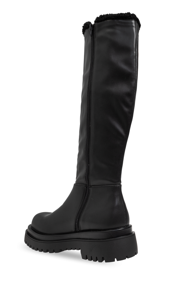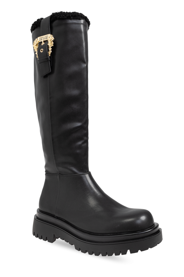 Presenting the epitome of winter elegance, the Versace Jeans Couture Faux Fur Boots seamlessly blend luxury with functionality. Clad in timeless black, these knee-high boots boast a sleek and sophisticated silhouette, perfect for the discerning fashion aficionado. The exterior, crafted from premium leather or eco-leather, exudes opulence while ensuring durability. Inside, the boots are lined with plush faux fur, offering unparalleled warmth and comfort during the colder months. Designed with a medium-height heel and a sturdy, treaded sole, these boots provide exceptional grip and stability, making them ideal for navigating winter terrains. A concealed side zipper allows for effortless wear, maintaining a streamlined appearance. Adding a touch of grandeur, a golden lion head motif adorns the side, a signature embellishment that elevates the boots\' prestige and sets them apart from the ordinary. Why Choose This Product? Luxurious black leather or eco-leather exterior Soft faux fur interior for maximum warmth Medium-height heel and treaded sole for stability Golden lion head detail for a touch of elegance Concealed side zipper for easy wear