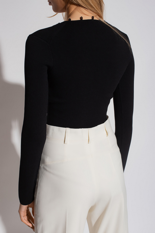 Black ‘Danique’ cropped cardigan from Nanushka. Made of materials from sustainable sources, this long sleeve design features button fastenings and neckline with decorative trims.