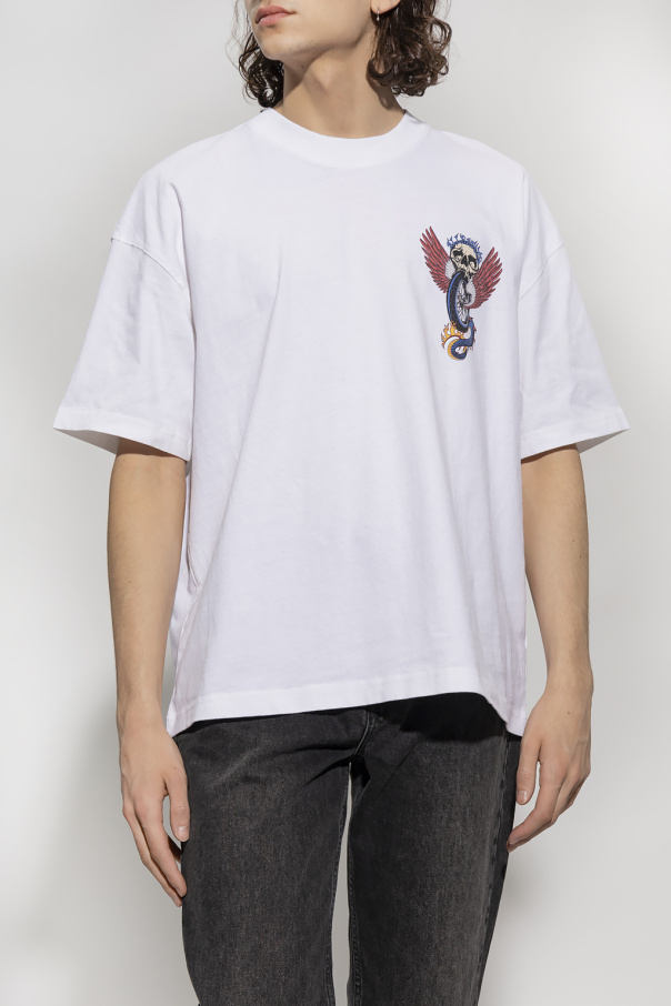 White ‘Road’ T-shirt from AllSaints. Made of organic cotton, this short sleeve design features a multicolored print and ribbed crew neck.