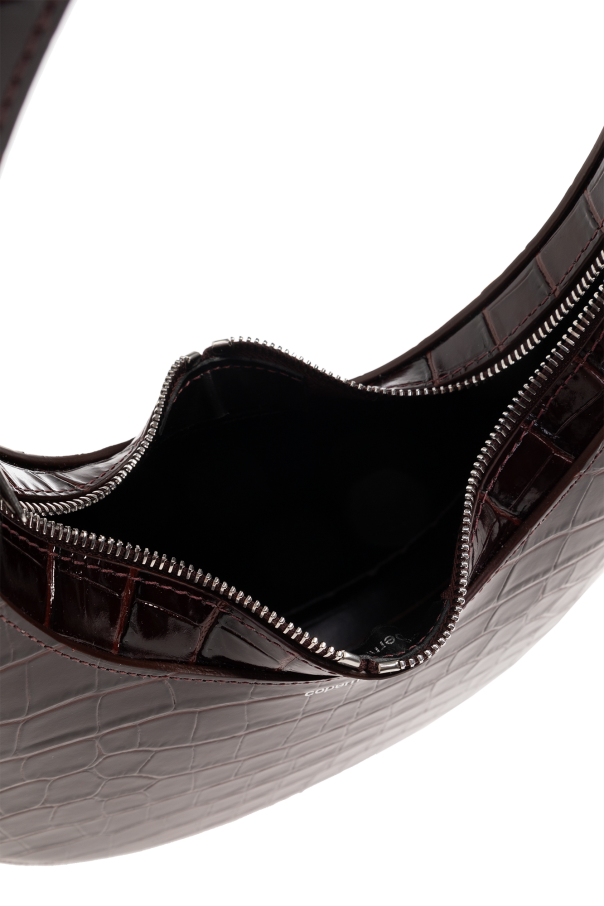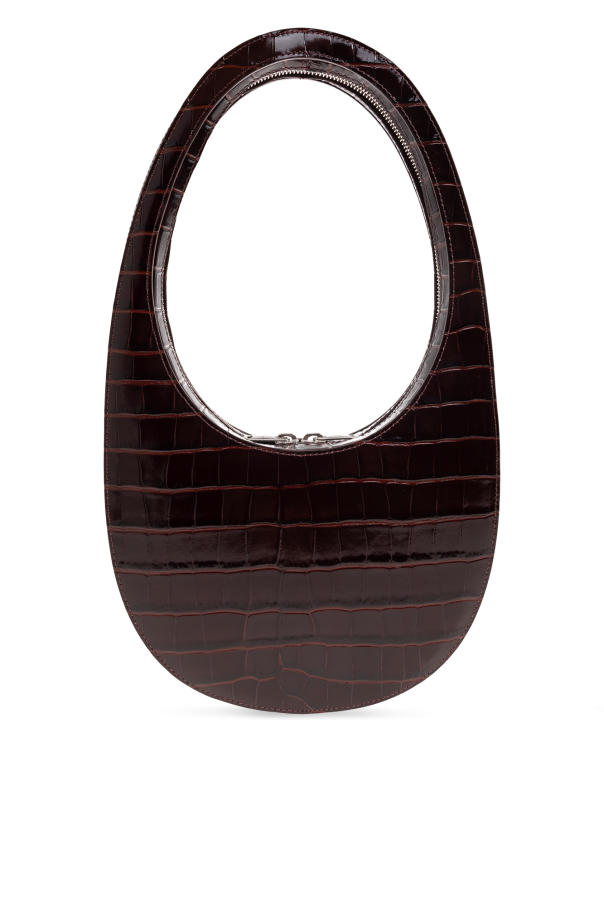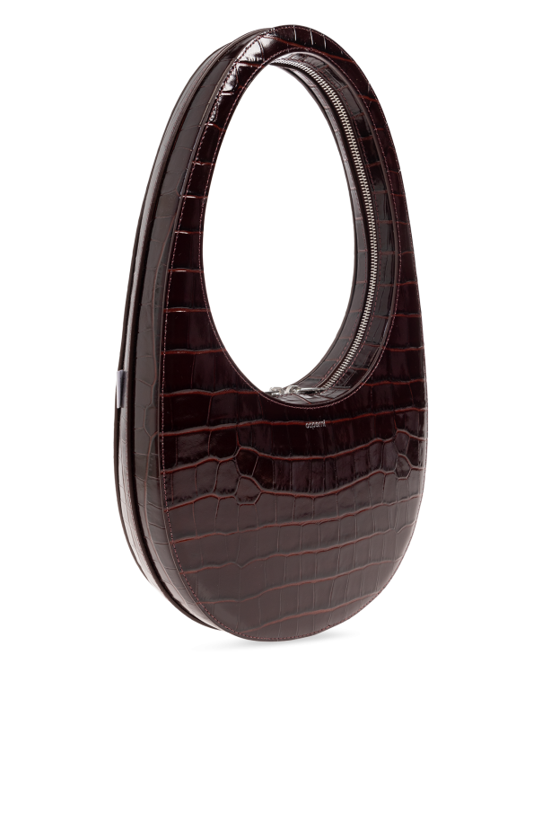 Maroon ‘Swipe’ shoulder bag from Coperni. Made from calf leather with a crocodile skin effect, this design fastens via a two-way zip and showcases a printed logo on the front. It is complete with a half-round handle, silver-tone metal hardware and one internal compartment.