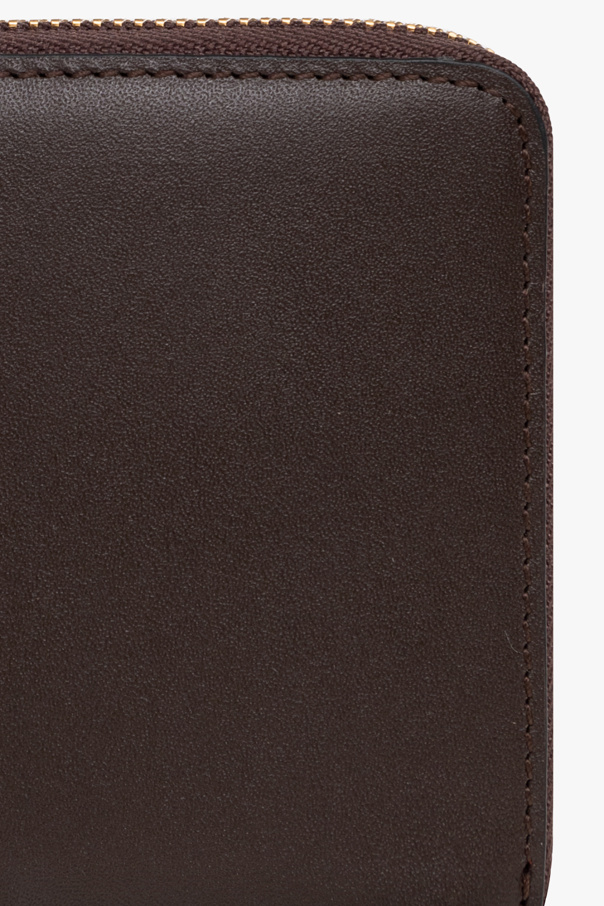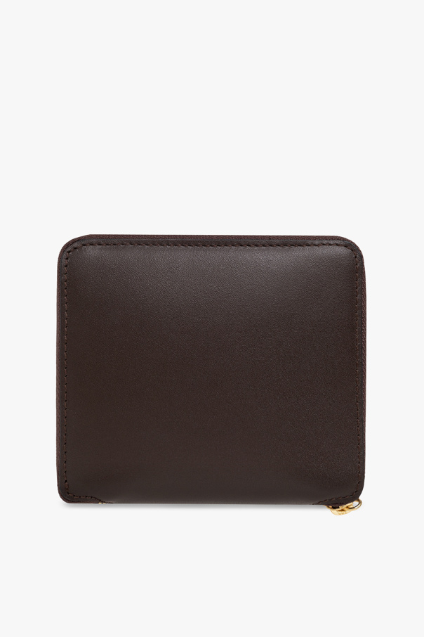 Brown wallet from Comme des Garcons. Crafted from cow leather, this item features a zip fastening, gold-tone metal hardware and one bill compartment, two slip pockets, four card slots and one snap-fastened coin pocket inside.